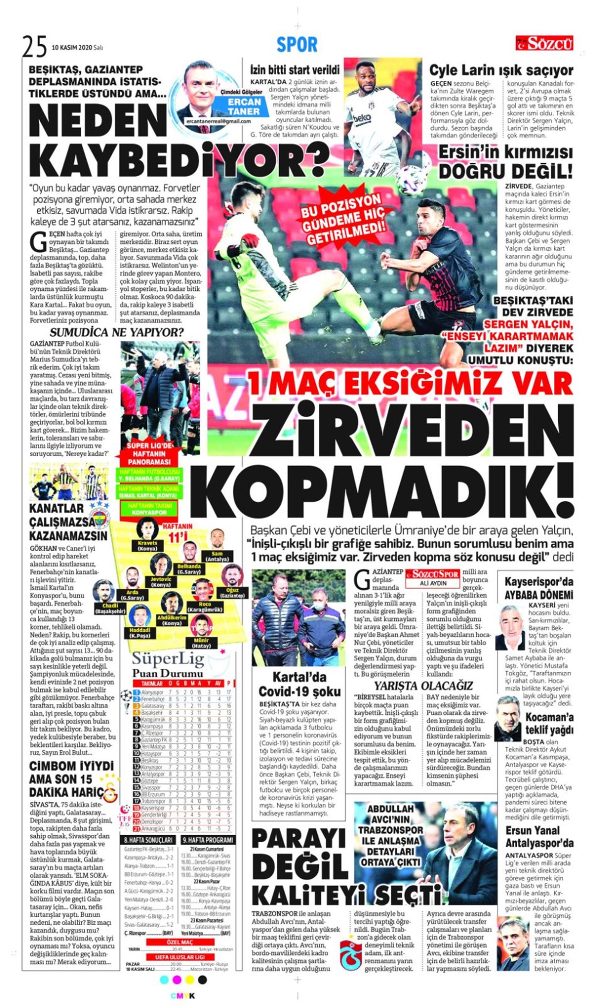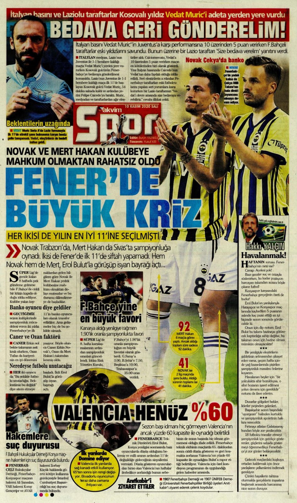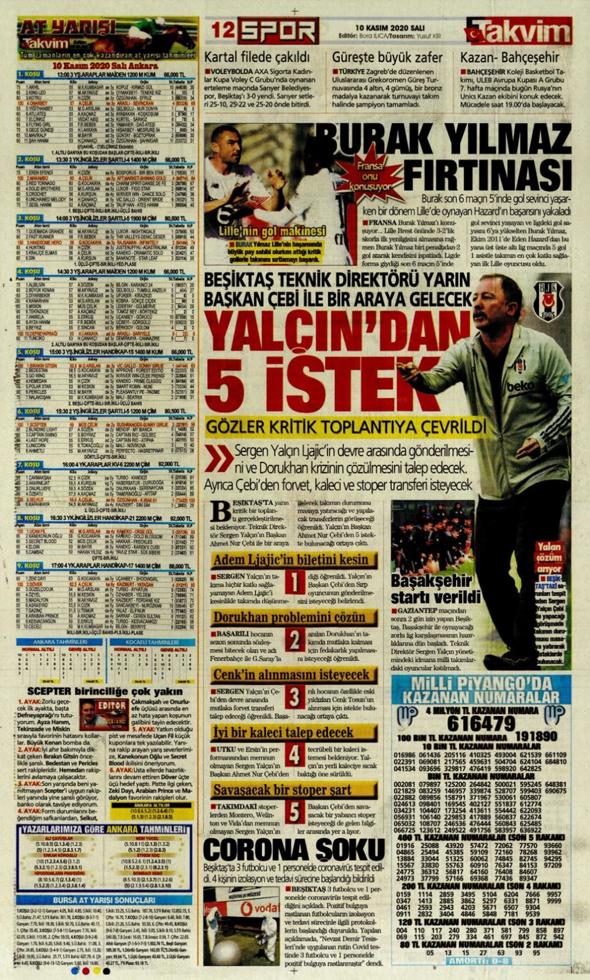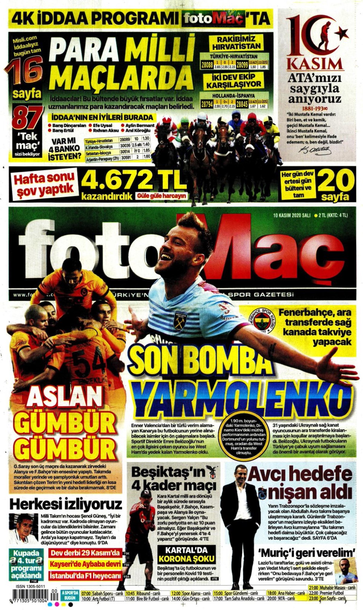 10 Kasım 2020 gazetelerin spor sayfalarına, Beşiktaş, Fenerbahçe, Galatasaray ve Trabzonspor’un transfer haberlerine, 1 dakikada göz atın.